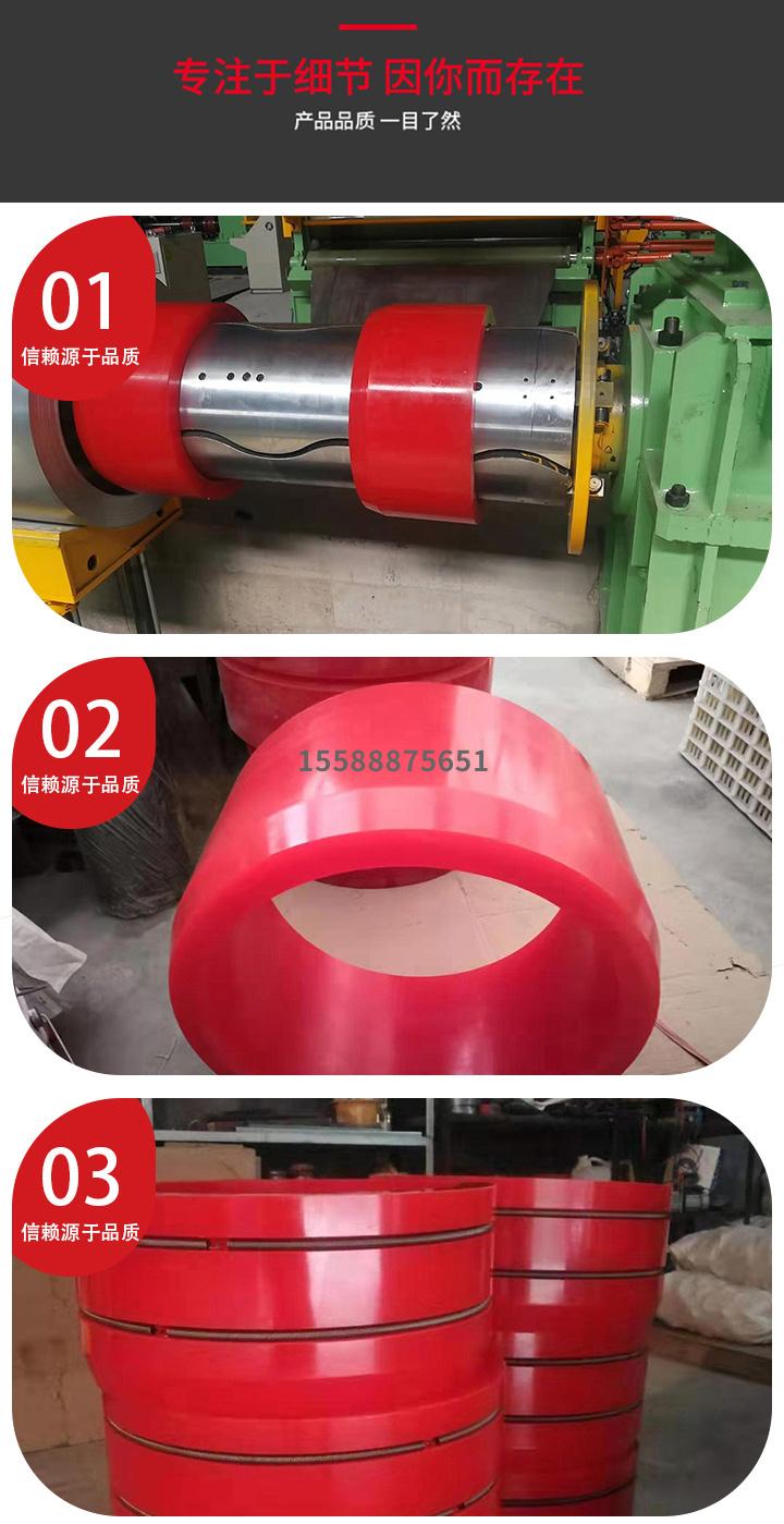 鋼卷內(nèi)徑由610增大到760所用的開卷機(jī)增徑膠套,根據(jù)開卷機(jī)自己卷筒尺寸,做了很好的配合,可以快速解決鋼卷內(nèi)徑變換的問題,避免了鐵制墊圈的弊端,使用方便,增徑效果好,具體尺寸可詢15588875651為您解答!